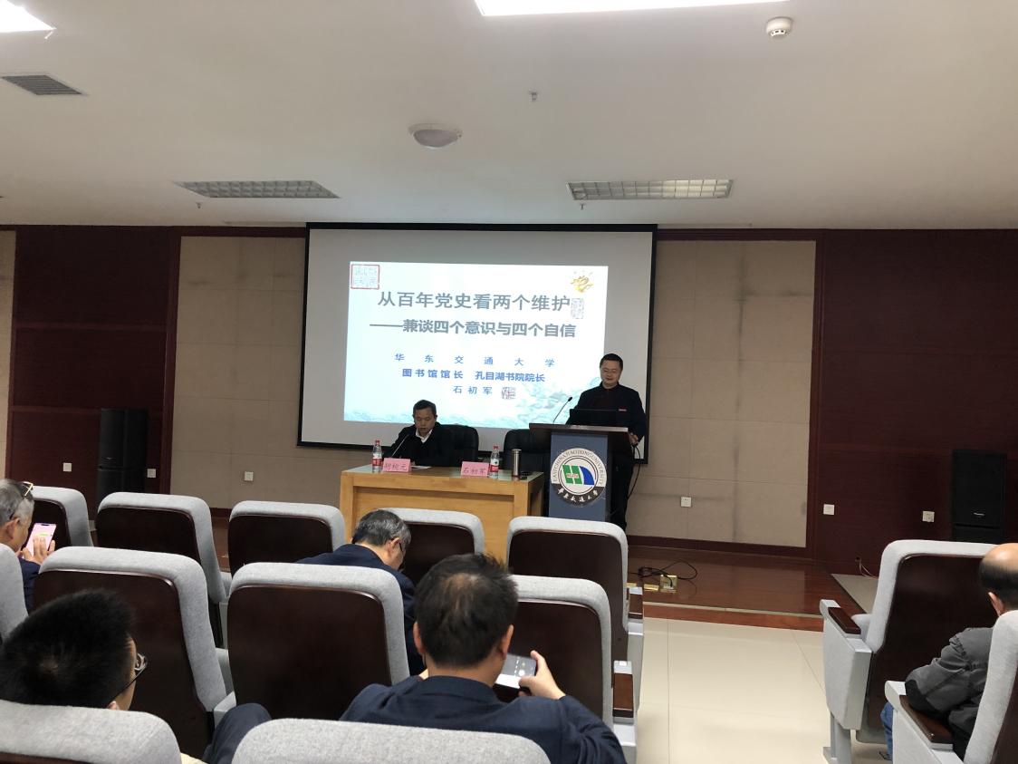 为推动公司党史学习教育走深走实、向纵深发展,激发全院师生更加自觉地从党的历史中汲取开拓前进的智慧和力量,不断提高政治能力、理论水平和工作执行力。4月15日,公司特邀公司党史宣讲团成员、图书馆馆长、孔目湖书院经理石初军老师,为全院师生党员及入党积极分子带来一堂题为“从百年党史看‘两个维护’,兼谈四个意识与四个自信”的党史学习教育专题党课。公司党委书记胡桃元主持。