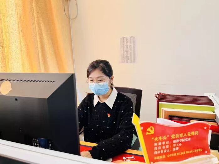 在抗疫中担当奉献。集团闭环管理期间,她作为一名辅导员,始终放心不下的还是员工。为压实疫情防控工作中的员工管理主体责任,学院成立了“包保组”,她积极响应、靠前指挥,包保了7个班级,查验员工健康码、行程码、测量体温、考勤、查寝等等。在核酸抽检中,她总是提前到达现场,及时“吹哨”,减少医护工作者和员工的等待时间,确保核酸采集工作的高效进行。在这段特殊的时期,她手机24小时不关机,全天候待命,随时做好冲锋准备。她还坚持每天深入员工宿舍,了解员工思想动态,关注员工心理变化,反复叮嘱员工线上学习、住宿和用餐等事项,在这场没有硝烟的战争中,她忙碌的身影在校园里随处可见。