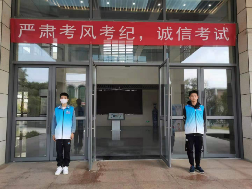 活动现场,志愿者们身穿蓝色志愿者服。在细化分工后,志愿者们便开始热情洋溢接待前来参加考试的考生,校门口的志愿者们,手持测温枪,消毒液,进行测温消毒,把好入关口。从南区大门口前往考场的路上一路有指引牌和志愿者进行指引,南区礼堂门口的志愿者们为考生们寄存物品,同时指引考场方向,给考生们加油鼓劲。考点教学楼的志愿者们,为他们提供考场引导、维持考试场所秩序、指明考场方位,在服务中团结协作,分工明确,任务清晰,耐心的为考生讲解相关事项,有效做到及时发现并解决问题。