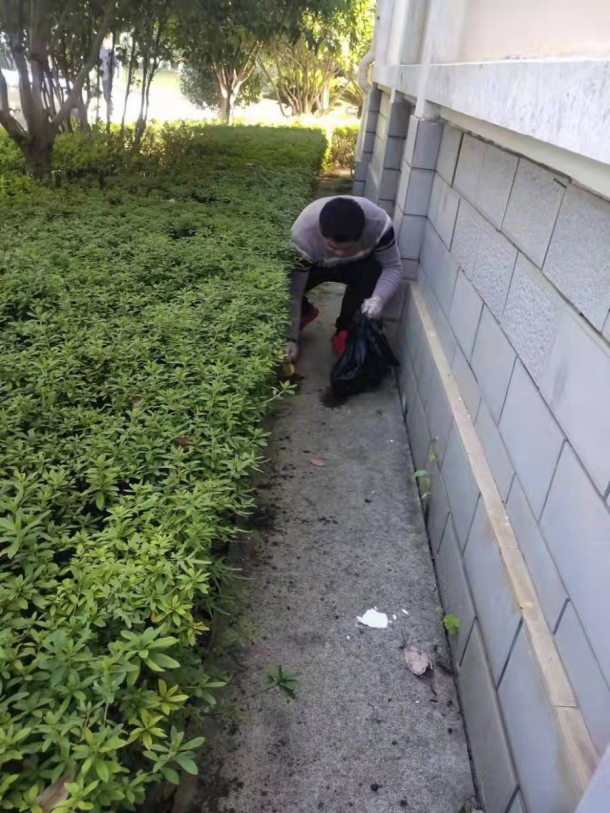 第二天,志愿者们打扫了宿舍37栋周围的草丛
