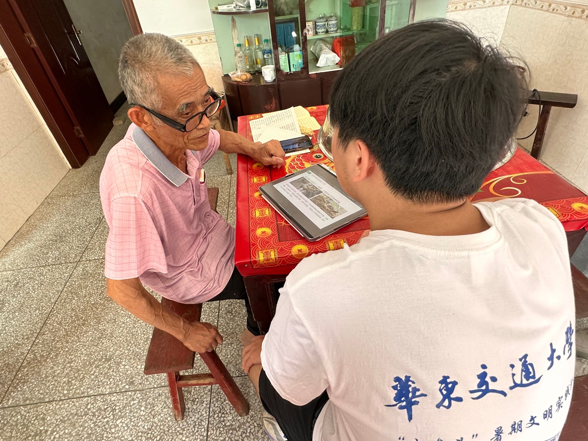 在葛田乡古田村张玉荣书记的引导下,“轨迹红火炬”实践队走访看望井冈山市上古田村的老党员谢文泉同志,实践队队员们认真聆听了老同志与共产党的故事。1983年,谢文泉老人在武警部队时就毅然选择了加入中国共产党,是有40年党龄的老党员。在40年的党员生活中,谢文泉始终坚持不忘初心、牢记使命,退伍回村后便积极投入乡村建设。他告诫年轻人:“要坚定不移跟党走,坚持共产主义信仰。”给实践队员起到了很好的模范作用,队员们在与老党员的交流中也了解到上古田村乡村振兴背后的故事。