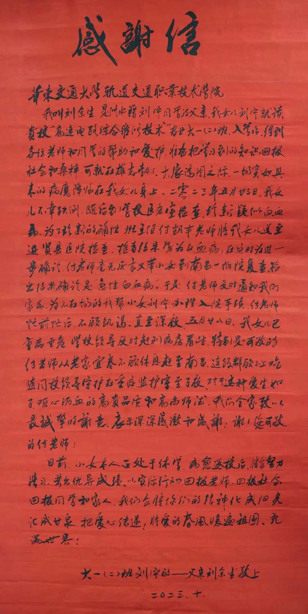 刘宁是学院2022级高速铁路综合维修技术专业2班的员工,今年5月突发急性白血病,在南昌大学第一附属医院抢救,刘宁的病情牵动着学院领导和师生的心。在刘宁昏迷期间,学院领导主动前往医院慰问捐款、各班班长自发发动捐款、全院师生自觉转发水滴筹,帮助刘宁渡过难关,在经过6个月左右的治疗,刘宁同学成功渡过危险期,目前正在康复中。