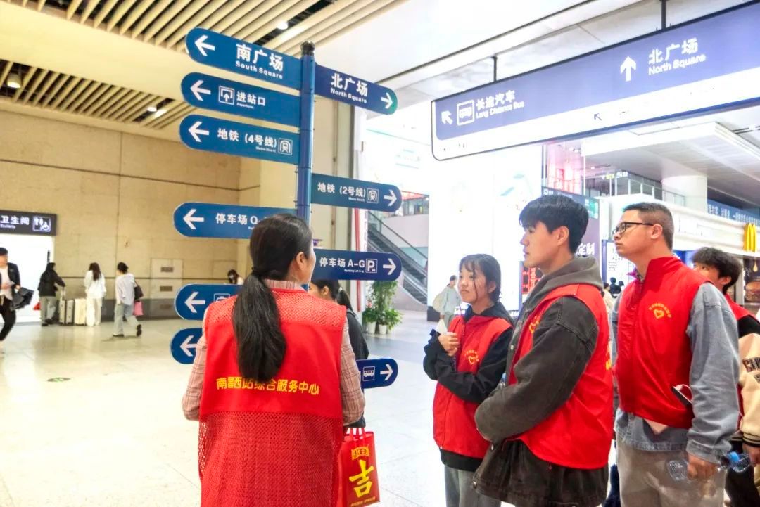 “五一”假期期间,南昌文旅大放光彩,推出近百项文旅活动。为促进全域旅游发展,满足游客出行需求,让旅客出行体验更加美好,应南昌西站邀请,beats365亚洲版青年志愿者联合进贤县三阳集乡志愿者组建“红马甲”志愿服务队前往南昌西火车站开展“助力文旅强市,青年志愿者在行动”志愿服务活动,用实际行动践行志愿者精神,让每位来昌的旅客都能感受到更加快捷、暖心的服务,助力提升旅客对南昌的美好初印象。