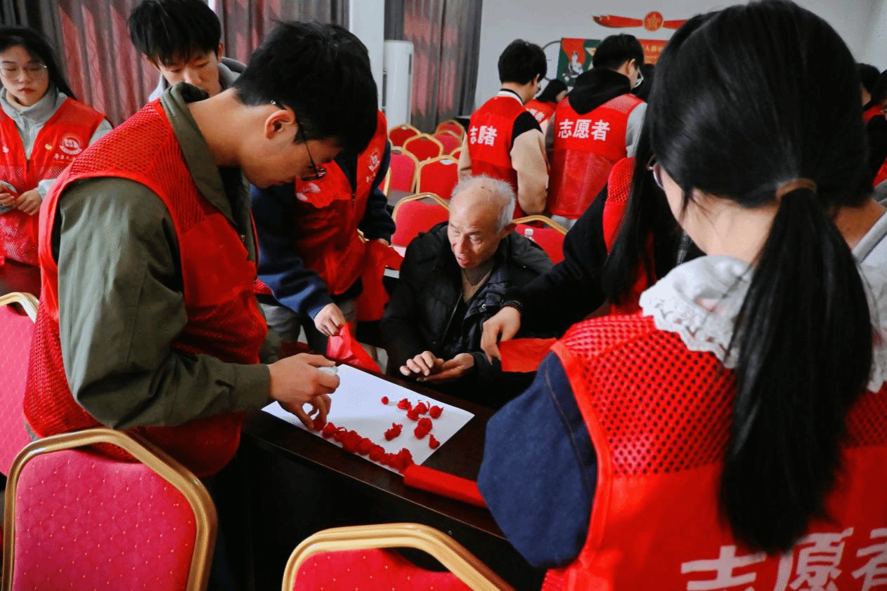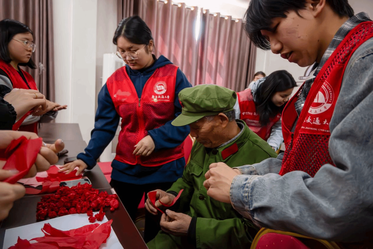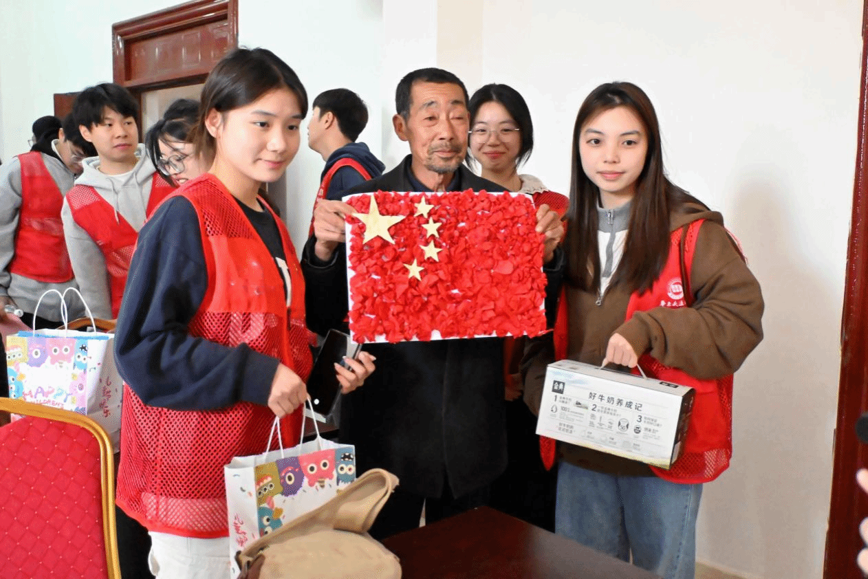 随后,大家和老兵们一起手制国旗。他们以红为基底,五颗黄色五角星黏附其上。两色碰撞,熠熠生辉,象征着我们心中坚定的信仰与追求。青年们和老兵们在制作过程中配合默契。这不仅是一样手工作品的诞生,更是年轻一代与革命前辈之间情感与精神的交融,共同绘就了一幅传承画卷。