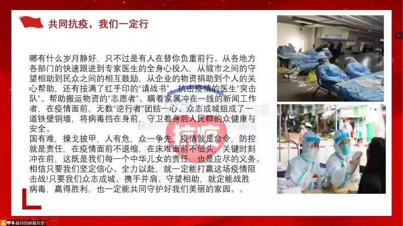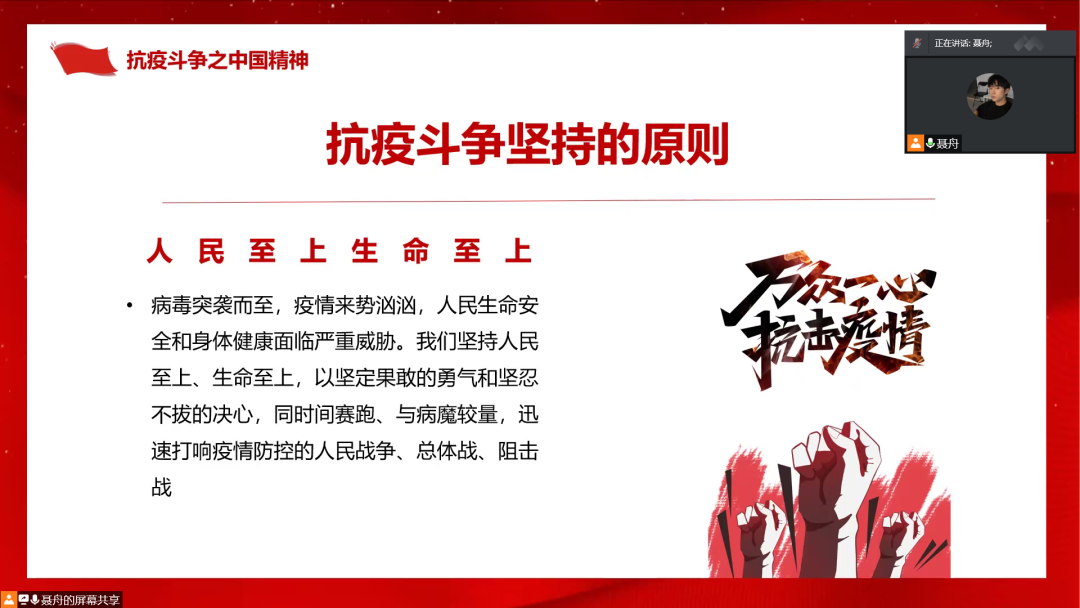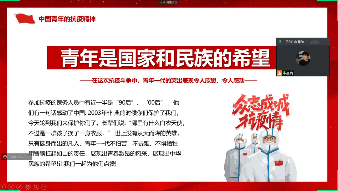21高职扩招3班聂舟同学给大家讲述抗疫斗争之中国精神和中国青年的抗疫精神,在这场同严重疫情的殊死较量中,中国人民和中华民族以敢于斗争、敢于胜利的大无畏气概,铸就了生命至上、举国同心、舍生忘死、尊重科学、命运与共的伟大抗疫精神。