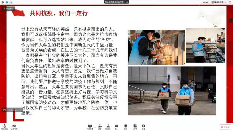 3月25日晚上,公司第三期全体英才成员采用线上的形式举行了本学期第一次理论课,学习本次抗疫精神。旨在让英才学员们深刻领会和全面把握疫情防控期间各项要求,学习志愿者抗疫精神,努力做好正能量引导。