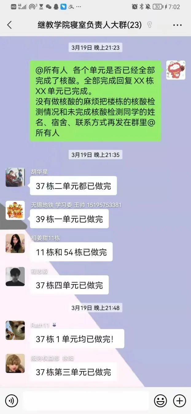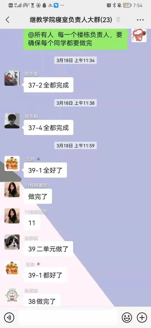 青年榜样,赤子之心。作为一名预备党员,她的积极和热情始终激励着后辈,鼓舞着团队。正如积极协助团委老师获得学院首次国赛获奖以及省级荣誉突破时那样,面对此次疫情防控要求,2022年3月16日学校实行闭环管理,平雨昕同学主动请缨,协助团委老师落实校团委的紧急任务,当即招募楼栋疫情志愿者,安排负责人前往各个楼栋进行摸排,组织楼栋负责人建立好楼层人员的联络群,方便大家反馈和解决问题。在宿舍楼栋防疫工作志愿者微信群里,平雨昕同学带动周围同学积极支持、主动配合学校防疫工作,始终深入一线带头工作,为打赢这场疫情“战”奉献着自己的青春力量。