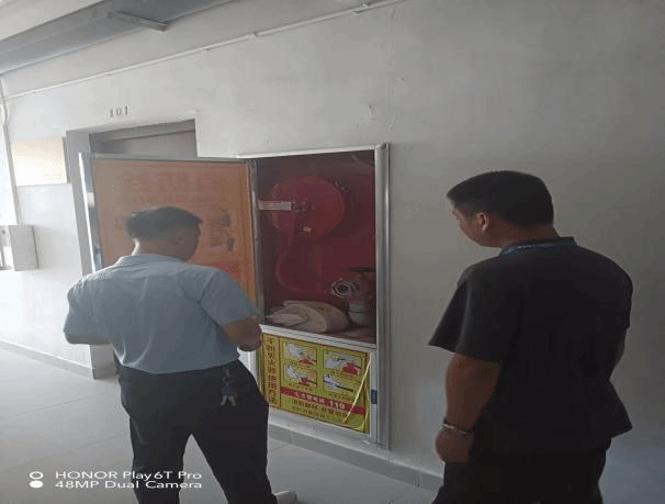接着检查组先后来到员工宿舍和校园内食堂进行拉网式排查。在员工宿舍,检查组对内部消防设施、电器设备、疏散通道等进行了逐一检查。其中检查了消防器材的配备完好情况,并测试了消防报警系统的正常运行;在食堂,检查了各个燃气设备、电器线路是否拉闸关闭等情况,以确保暑期消防安全。