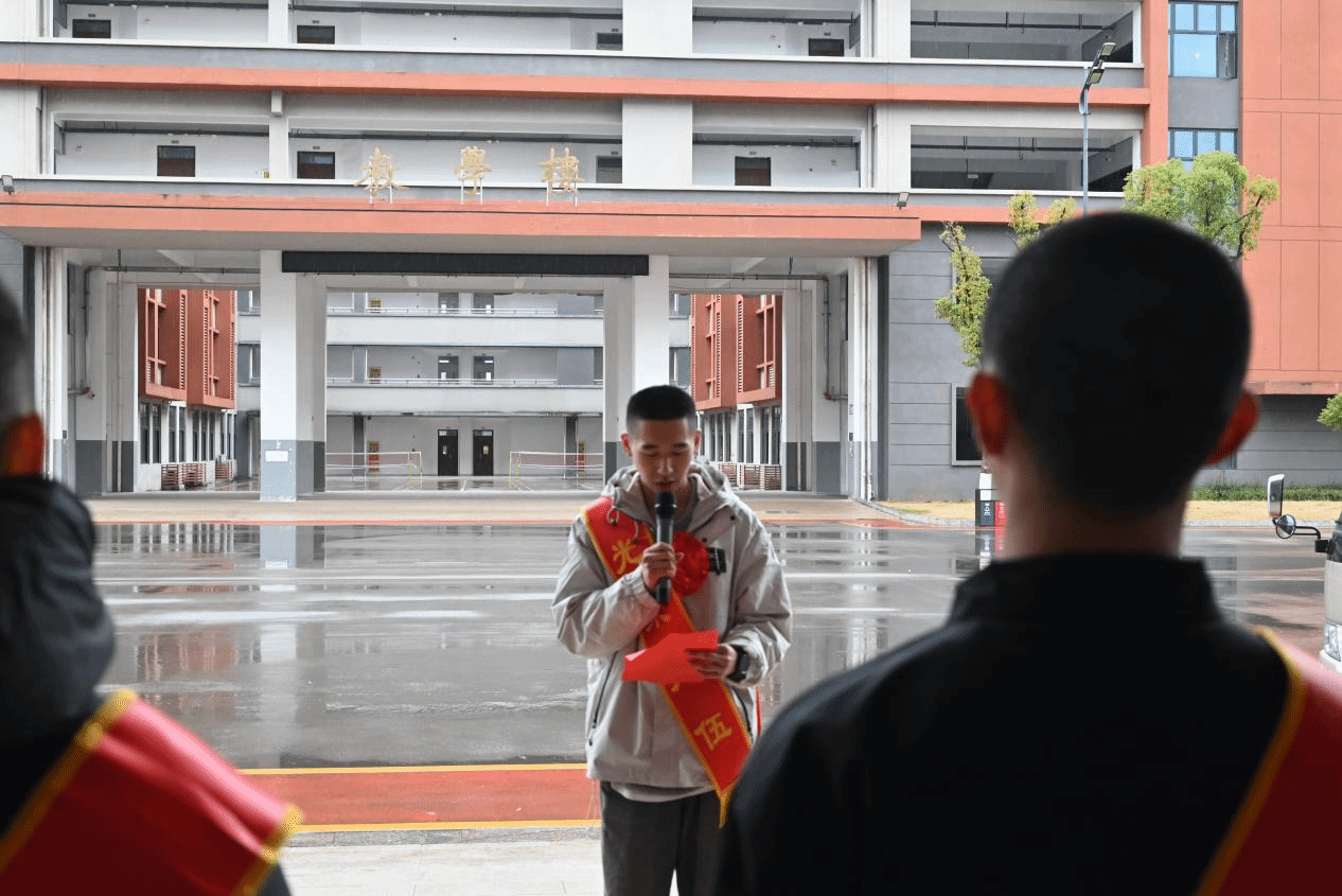 入伍毕业生宋晨阳作为代表发言,他表达了自己投身国防、报效祖国的坚定信念。他激动地说:“应征入伍不仅是一份无上的荣耀,更是一份沉甸甸的责任。我们将以青春和热血捍卫祖国的每一寸土地,绝不辜负母校的辛勤培养和家人的殷切期望。”