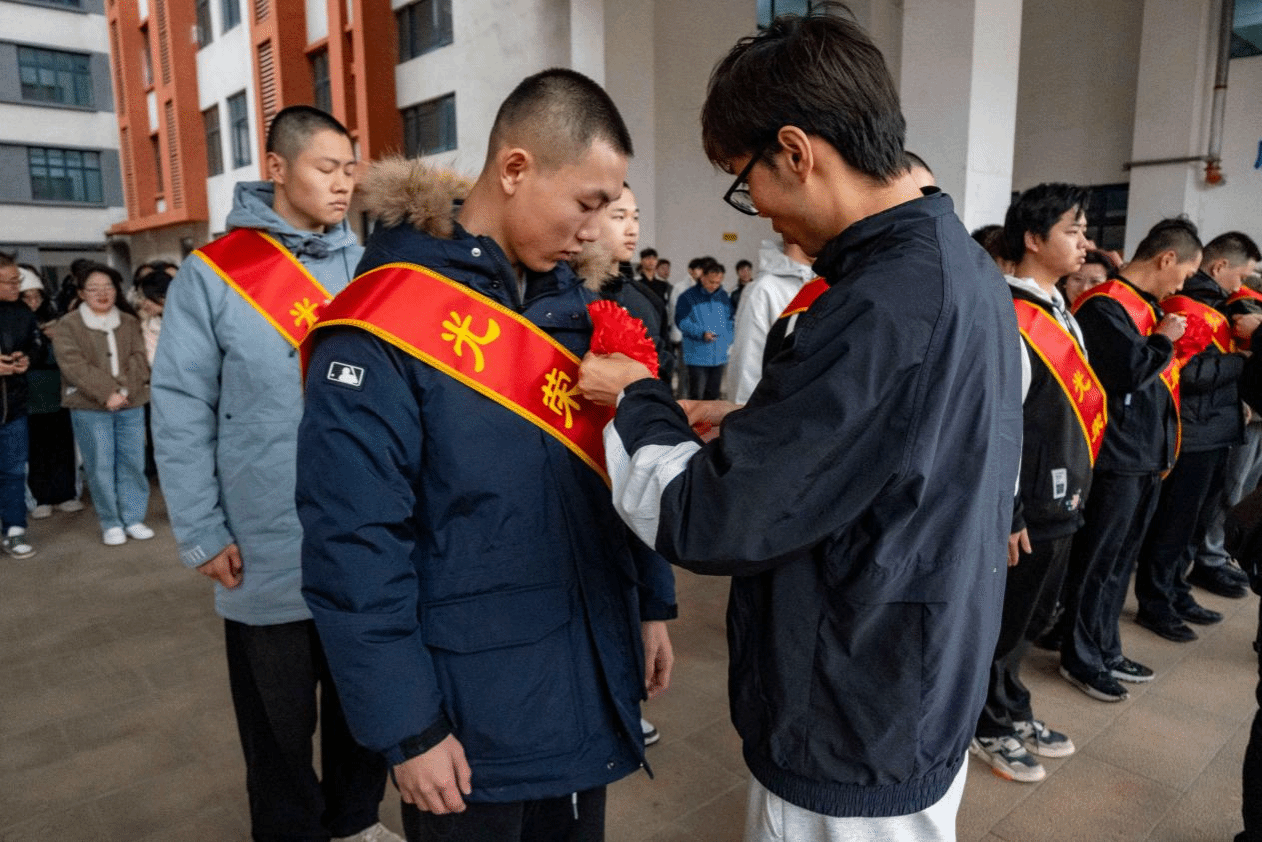 2022级辅导员为所有入伍毕业生佩戴红花,颁发纪念品,以表达对他们的祝福和鼓励。一花一佩寄深情,愿你们以青春之名,护山河无恙!