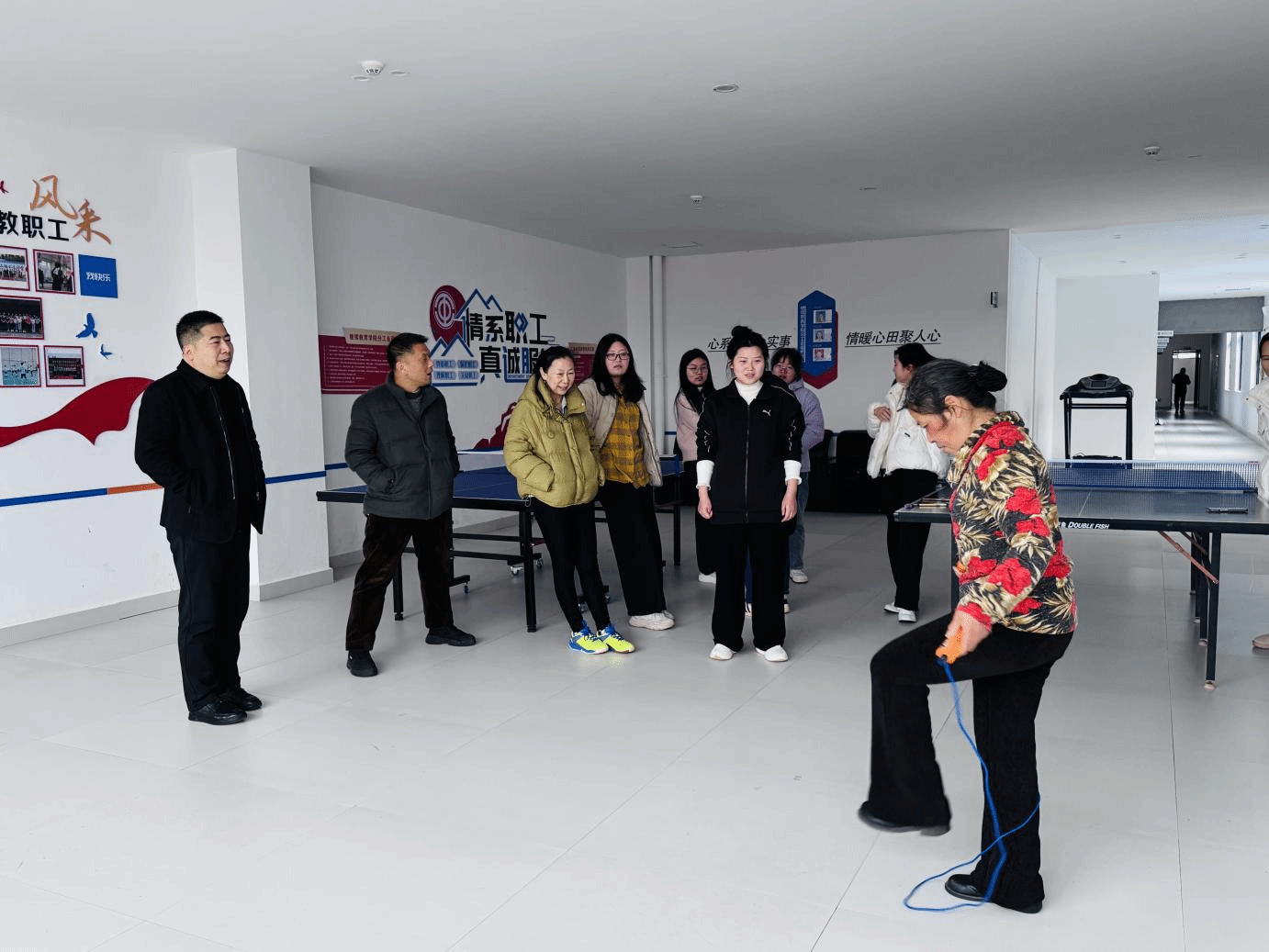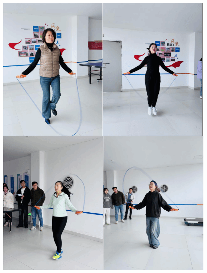 随着一声清脆的哨响,三八妇女节跳绳比赛正式拉开帷幕。老师们迅速甩动跳绳,绳子在空中划出一道道优美的弧线,呼呼作响。老师们身轻如燕,脚尖轻点地面,动作敏捷流畅;节奏沉稳,每一次跳跃都刚劲有力,充满韵律。围观的老师也热情高涨,加油声、欢呼声此起彼伏,整个活动室沉浸在一片欢腾之中。